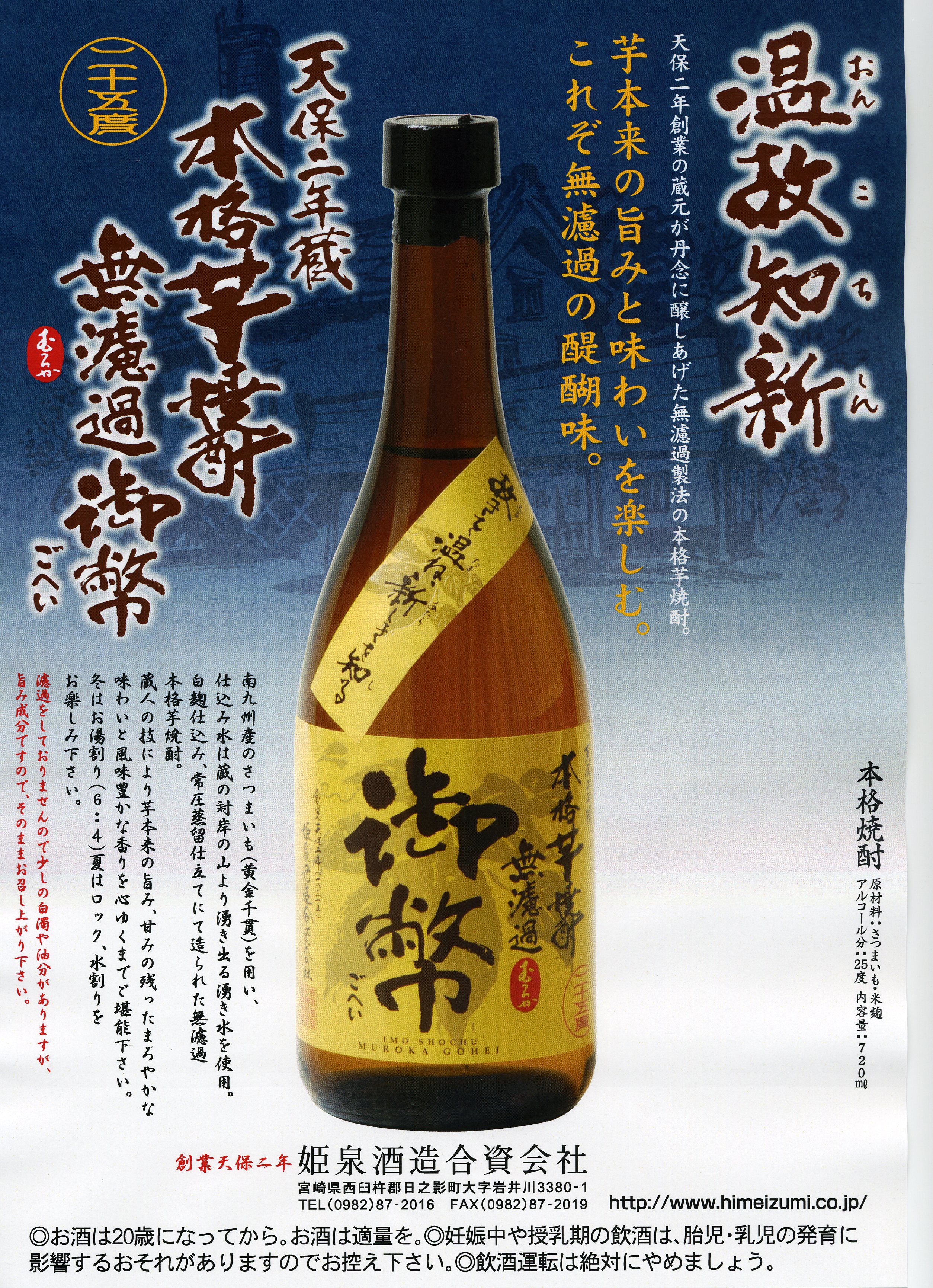 | 内容 | この度、本格芋焼酎「無濾過御幣」25度720mlを平成21年9月10日(木)に発売致します。商品のお問い合わせにつきましては、上記お問い合わせフォーム、又お電話、FAXにてお受けいたしております。 【商品説明】 南九州産のさつまいも(黄金千貫)を用い、仕込み水は蔵の対岸より湧き出る湧き水を使用。白麹仕込み、常圧蒸留仕立てにて造られた無濾過本格芋焼酎。 蔵人の技により芋本来の旨み、甘みの残ったまろやかな味わいと風味豊かな香りを心ゆくまでご堪能下さい。 冬はお湯わり(6:4)夏はロック、水割りをお楽しみ下さい。 濾過をしておりませんので少しの白濁や油分がありますが、旨み成分ですので、そのままお召し上がり下さい。 商品名 無濾過御幣(むろかごへい) 原材料:さつまいも、米麹 アルコール度数:25度 白麹仕込み、常圧蒸留仕立て 内容量:720ml 小売価格:1,260円(税込み) 発売日:平成21年9月10日(木) |